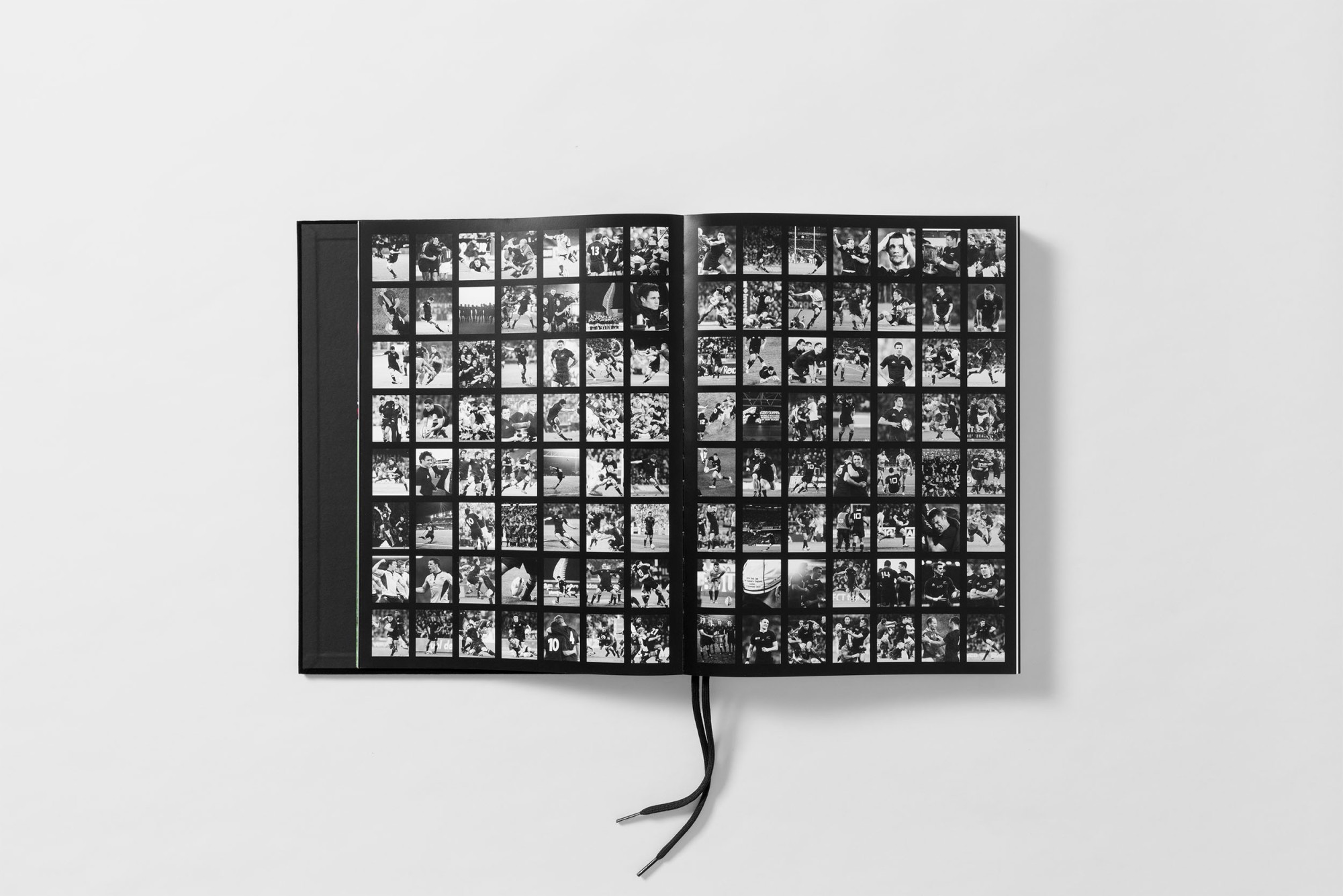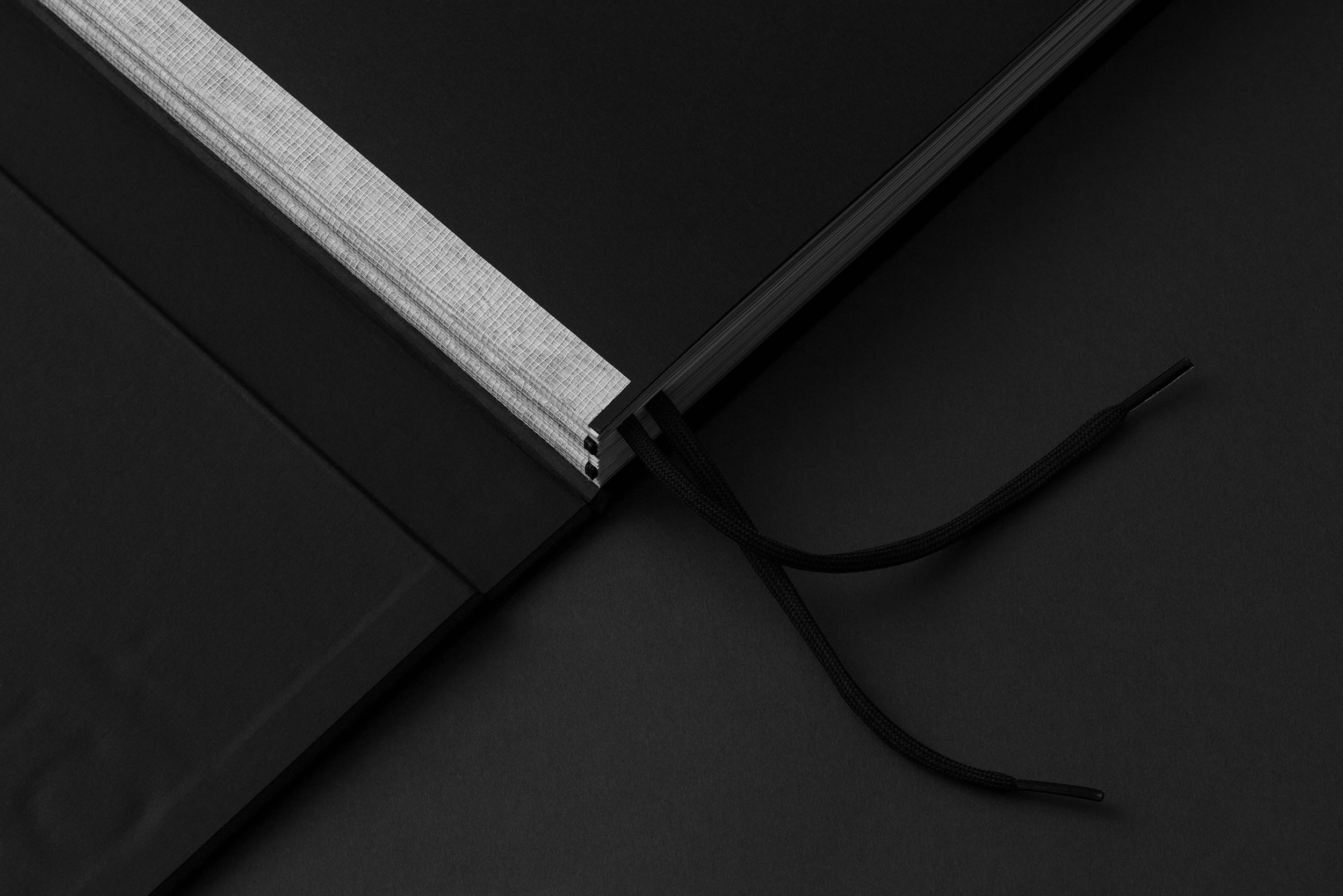 Cloth bound hardcover + slipcase, Swiss layflat binding, adidas boot lace ribbon, 3.3kg, 240 pages